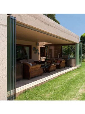 Opening and closing the system is a breeze, thanks to the high-quality rollers support the varying weights of glass used with the system, and durable extruded aluminium hinges and fittings ensure long-lasting quality. Our frameless stacking doors are also designed to be weather-resistant, with a bubble seal on the metal frame to improve resistance to the elements.
